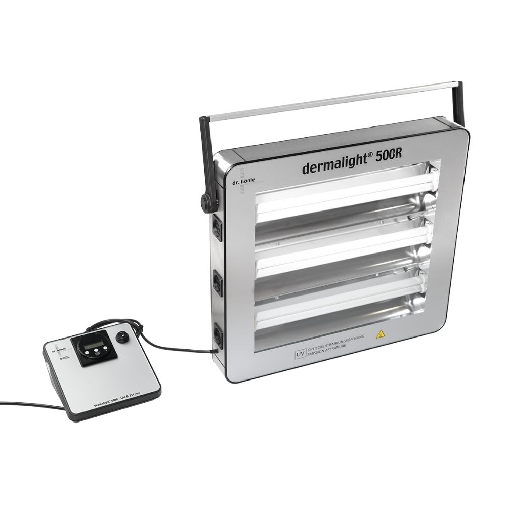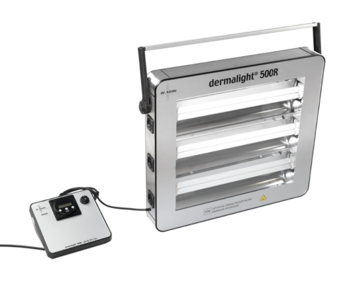 Il nuovo Dermalight®500/3 è stato sviluppato appositamente per il trattamento domiciliare. Particolarmente potente e con un design compatto consente di trattare diverse aree del corpo come mani, piedi, viso o décolleté. La centralina di controllo esterna garantisce un’impostazione comoda e precisa del tempo di trattamento. Gli emettitori si spengono automaticamente al termine del tempo di trattamento selezionato. Il Dermalight® è disponibile con 3 emettitori 311 nm a banda stretta da 36W.